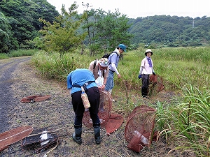 皿池での引き上げには、見学希望の親子も参加。小学校の子どもが在来種のカメの保全に興味があるとのことで、両親共々勉強してくれた。