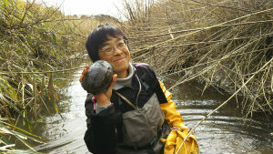 雨の中、中池見湿地を中池見ふれあいの里の上野山さんにお付き合いいただいて、歩きました。 カメたちはここしばらくの高温でまだいつもの場所に来ておらず、また、思いのほか高い水位で他の水路の捜索も上手くいかず、1個体のみの捕獲でした。 12月7日