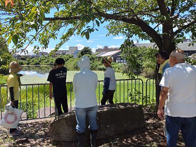 石清水八幡宮境内の植物について宮司が説明し、私たちは放生川と石清水八幡宮内の池で前日に罠かけし、当日に引き上げた生き物の説明。