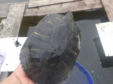 春は2・3歳の若く小さなカメが多く捕れるのだが、今は大きい個体が結構捕れる。今回はデカいアカミミガメに混じってクサガメ2個体とスッポン1個体も入っていた。