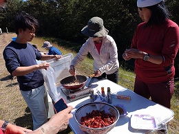 今回伊藤さんが料理道具一式を用意くださったので、シラサエビ(醤油バター、ラー油マヨネーズ炒め)、ザリガニ(塩茹で)、ウシガエル(スープ)を料理して美味しく頂いた。生態工房&かいぼり隊の皆さん、流石に手慣れて手際がいい!地元の水守さんも定番のシラサエビの甘辛煮を持ってきてくださって楽しいお昼になった。