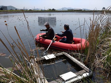 いつものメンバーに加えて、当日お手伝い頂いた方も。前回の調査では大きなアカミミガメがたくさん捕れた南側の日光浴罠はほぼ坊主で、北側が人気  。南側にヒシが繁茂しすぎたせいなのか、季節的なものなのか。焼け石に水だが罠周辺のヒシを取り除いた。