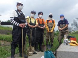 罠かけ後は「川いい会」さんと合流。「川いい会」さん主導で行なっている川整備を一緒に行った。今回は以前移植した植物の周りを土嚢と土砂で補強。土嚢は茨木土木事務所さんから提供していただいている。