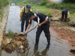 「川いい会」のお二人と一緒に工事後の川の小さな整備作業。放置しておいても川の環境は少しずつ回復していくだろうが、少し手をかけて、できる限り複雑な流れができるだけ早く戻ってくるようにしたいものである。