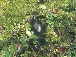 日曜のため工事は行われていないが、蛇篭を入れる予定の新浅川橋周辺、浚渫を行なう予定の区間の少し上流にに重機が入っていた。考えていたものよりかなり大規模なモノであった。また蛇篭を設置する川の両端の部分だけでなく、澪筋の真ん中にも重機が入り、水底を均していた。これは想定外。「生き物に優しい」ということだったので、当然澪筋の真ん中には触れないと思っていたのだが、これでは越冬中のカメが潰されてしまう。カメの越冬は現在工事をしているところより少し下流だと思われるので被害はまださほど出ていないと思うが、これからの工事がかなり心配である。 浚渫の予定の区間は今回もざっとカメがいないか捜索したが、幸い見つからなかった。強い寒気の後、3月並に暖かくなったので戻ってきていないかと思ったが、大丈夫のようだ。ただ問題は重機が入った場所。天王小学校の前(工事区間)から重機を入れると思っていたのだが、本来の工事区間の上流に入っている。これでは、カメが越冬している(しかも我々が入れない)深溜りをつぶすことになる。「カメを見つけたら逃がす」などと言っていたが、重機の規模からしてそんな丁寧な作業はなされそうにない。何とか交渉してカメを助けたい。 工事区間のチェックとカメの捜索を済ませてから場所をがらっと変えてカメ調査。水底で越冬しているアカミミガメを見つけた。外来種とはいえその姿は美しい。近づくとゆっくり水底を移動した。ぐっすり寝ているわけではないのだ。 1月10日