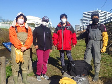 深溜まりと少し下流の2地点で罠かけをした後、川いい会の皆さんと一緒に、昨年度浚渫工事された区間で活動。川いい会の皆さんは例によってシャベルを駆使して環境整備。私たちはカメを探しつつ国内外来種ミズキンバイのチェックと駆除、ゴミ拾い。