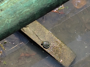 明神池 アカミミガメが甲羅干しをしていた。 |