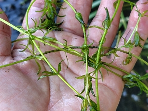測定の時間が不要になったので、日光浴罠周りのヒシの排除作業を行った。と、ある場所でガガブタ発見!ヒシがはびこってからとんと見なくなっていたのだが、久々に姿を見せてくれた。近くでクロモ(多分)も発見。カメは坊主だったが、なんか得した気分。