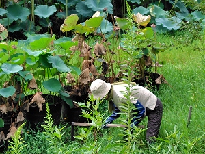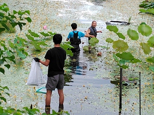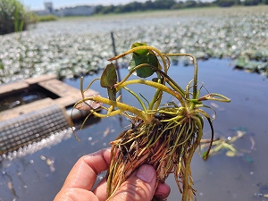 今年は淀姫(ハスの品種名)をポットで管理しているため、昨年より元気よく育っている。それらハスを見て(あまり興味ないかな?)、日光浴罠に入ったアカミミガメを観察し、外来水草を防除し、さらにガサガサもやって結構楽しんでくれたようである。
