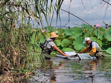 敦賀市にある中池見湿地でのカメ類の調査。