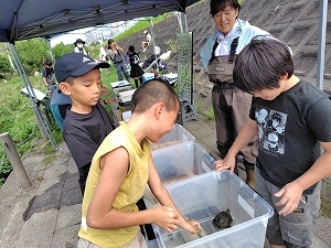 皿池での引き上げには、見学希望の親子も参加。小学校の子どもが在来種のカメの保全に興味があるとのことで、両親共々勉強してくれた。